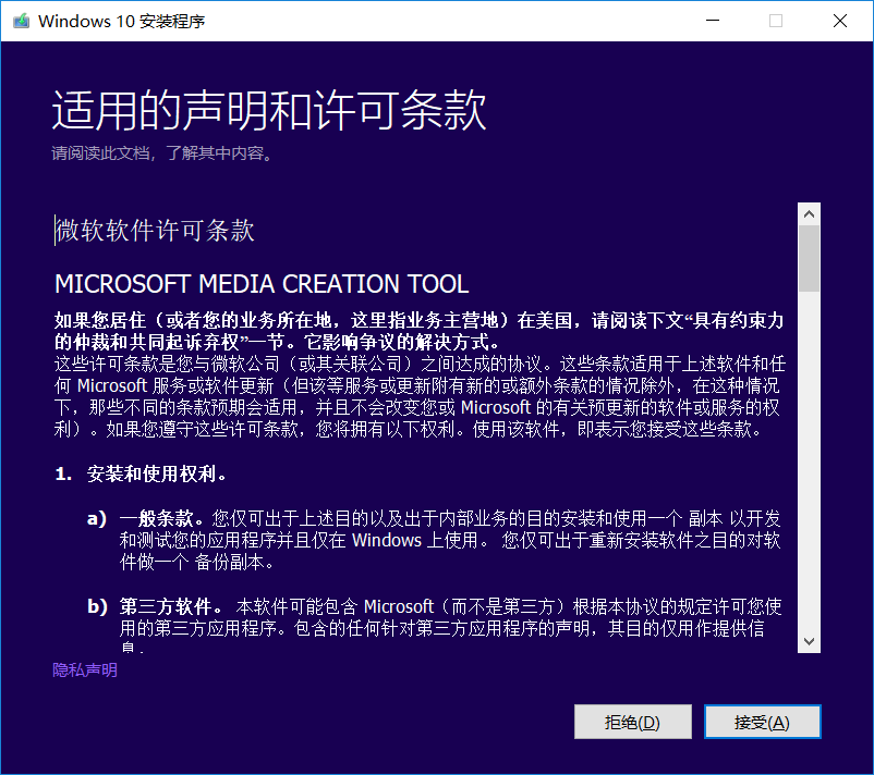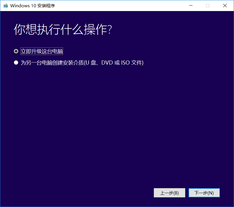 单击接受后你将跳转到执行操作页面!若你想创建一个windows10系统安装包的话,你直接选择为另一台电脑创建安装介质!然后下一步即可!
